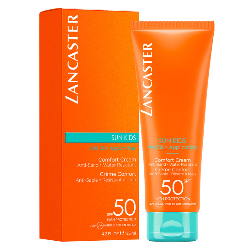 Lancaster SUN FOR KIDS Comfort Cream for Children SPF50, resistente all’acqua, protegge i bambini dai raggi solari. Facile da applicare, anche su pelle bagnata, la formula innovativa grazie all’esclusiva Full Light Technology affronta il 100% dei raggi solari: UVB, UVA, Luce Visibile e Infrarossi.